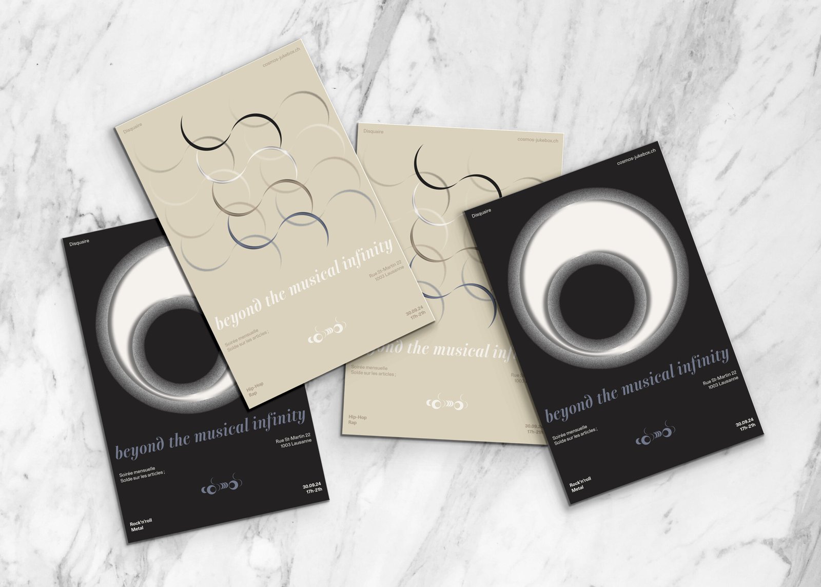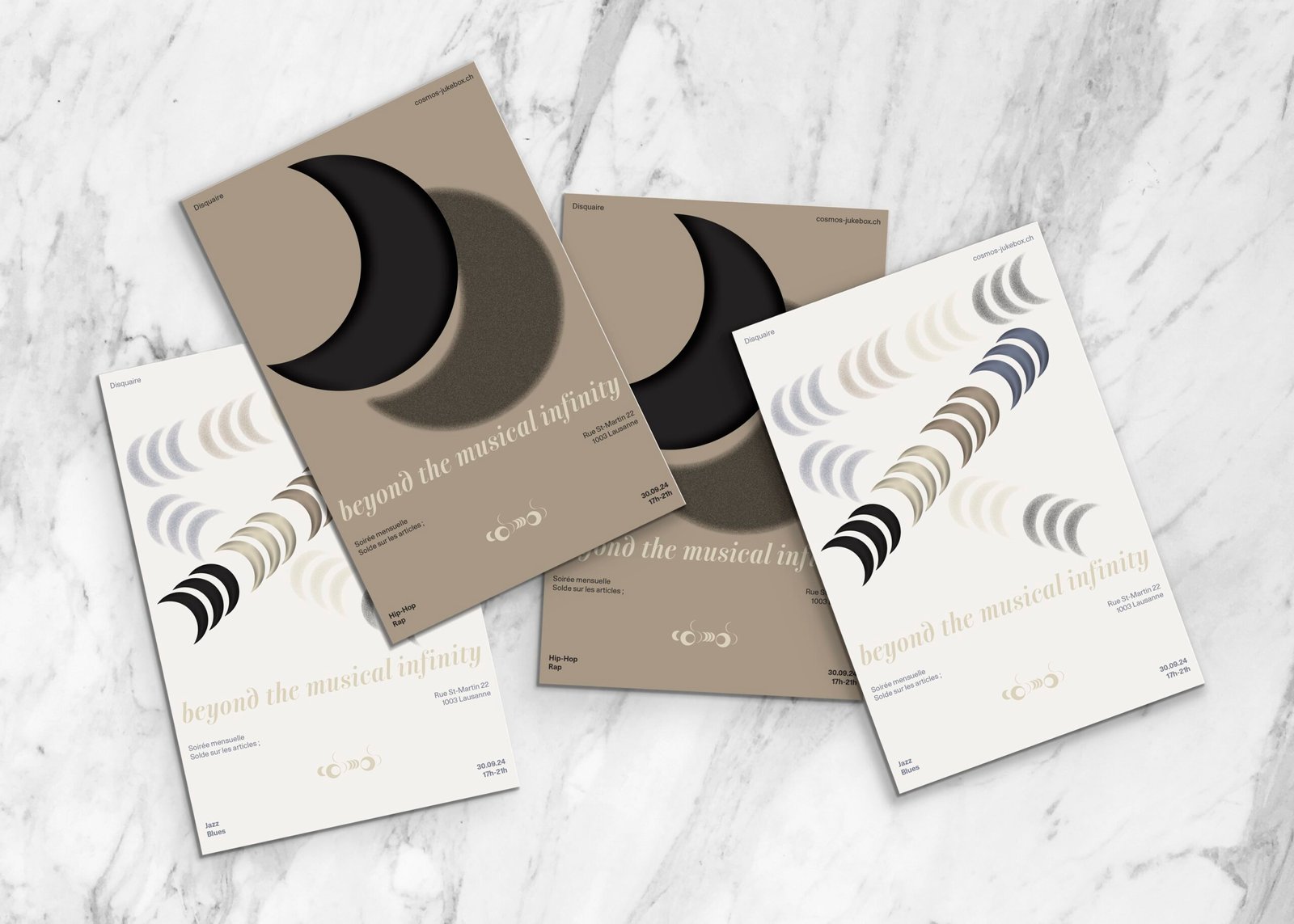 Ce branding fictif d’une boutique de disque s’inspire des ombres de révolution lunaire pour créer des lettrages. Il est de ce fait un langage graphique intriguant et virevoltant, pouvant s’adapter à différent type de support.