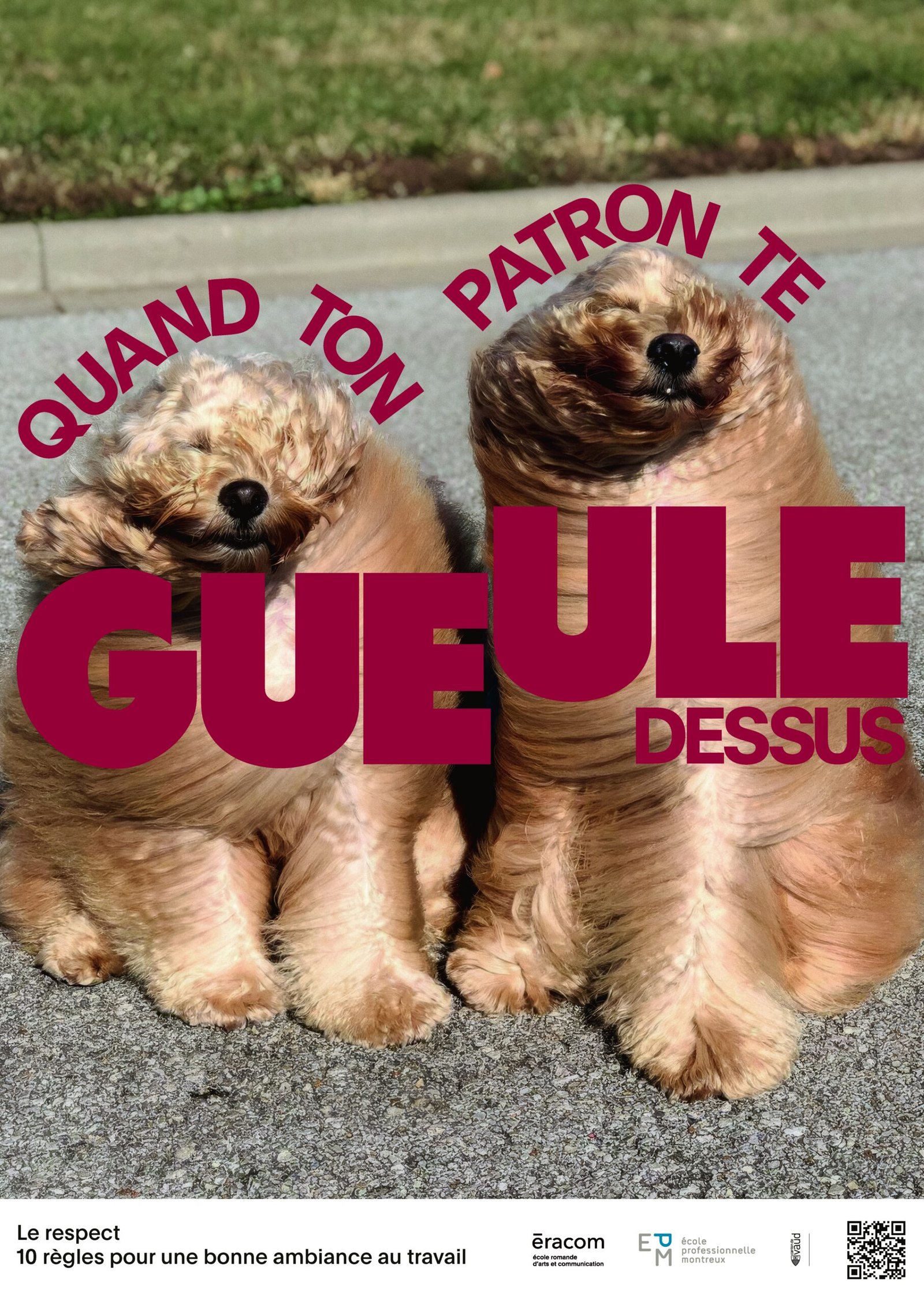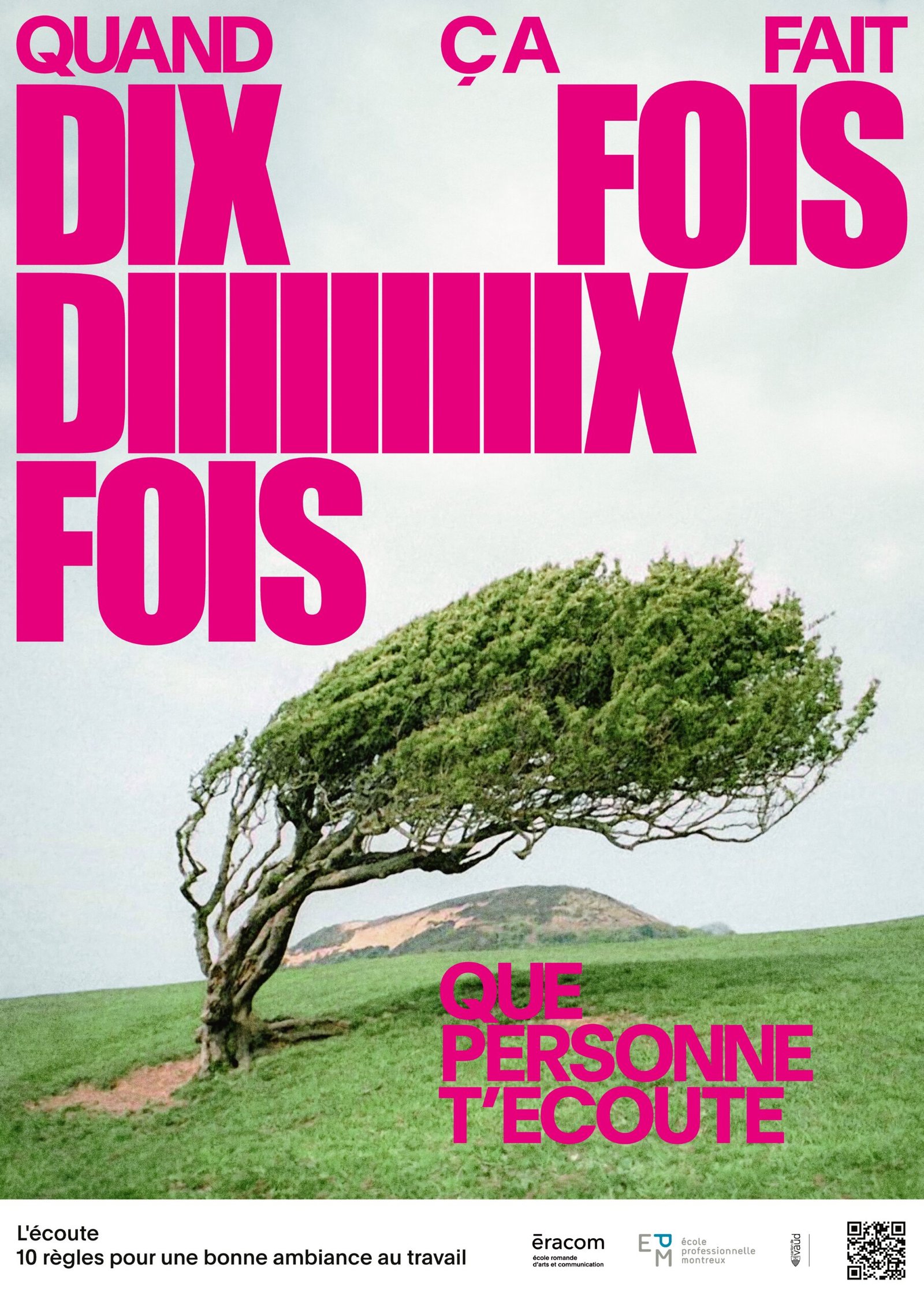 Ces dix affiches, réalisées pour les élèves de l’EPM de Montreux, reprennent leur liste sur les dix règles pour établir une bonne ambiance au travail. Afin de délivrer un message ludique et pédagogique, les affiches sont modelées par rapport au meme internet, conciliant un message clair et humoristique.